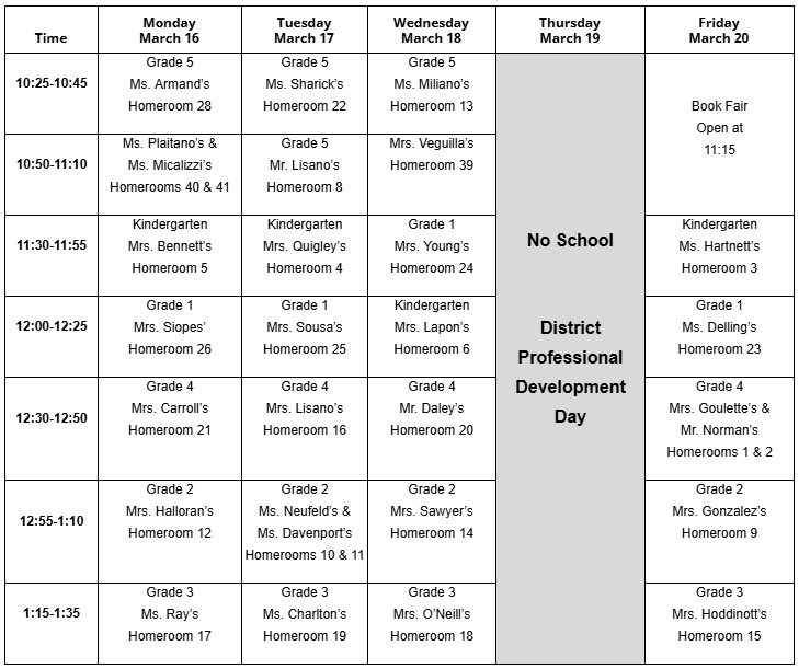 We are excited to announce that our Spring Scholastic Book Fair is just around the corner! This is a wonderful opportunity for your child to discover new books. Proceeds from the book fair directly benefit our school. Thank you for your support! See the class schedule below.