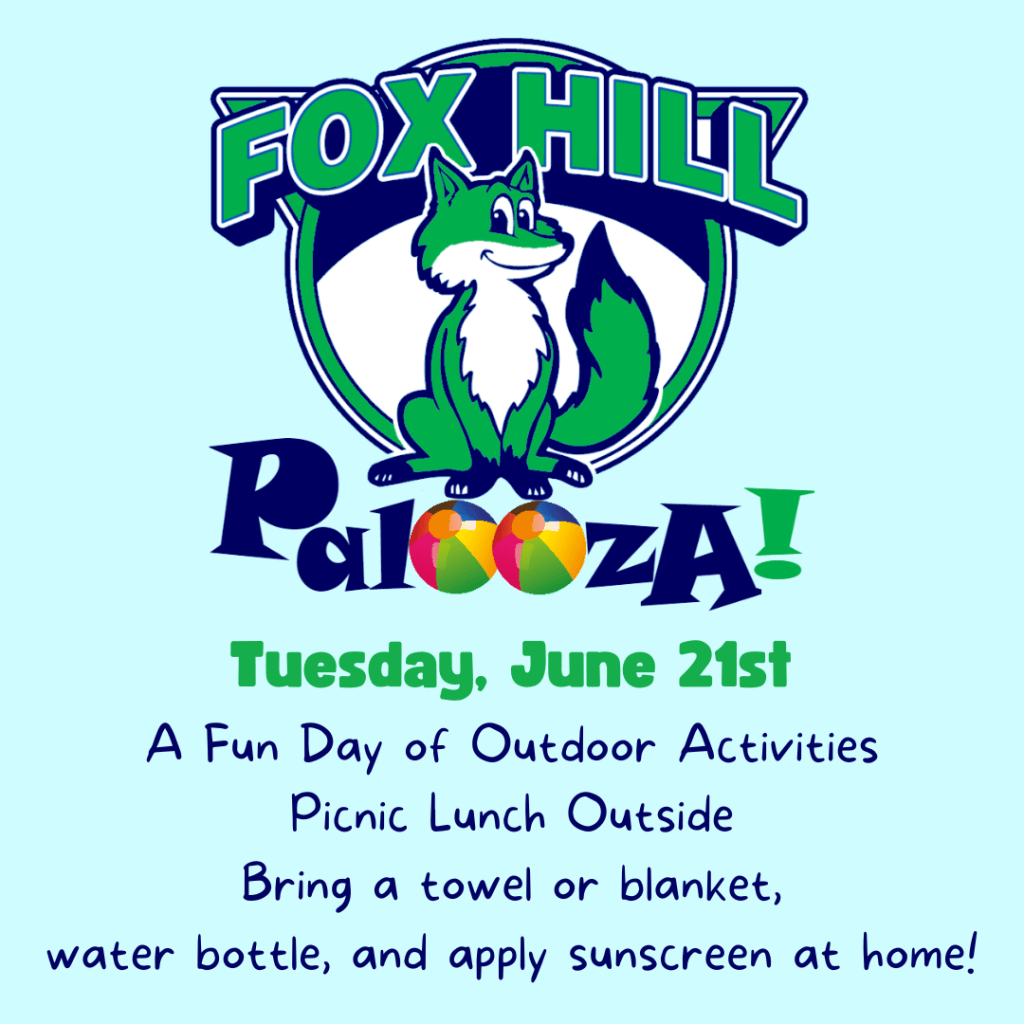 Mr. Rosenblatt is excited to announce that Fox Hill has earned a final whole school reward! On Tuesday, June 21st we will be celebrating Fox Hill Palooza! On this day students will have the opportunity to participate in some fun and exciting outdoor activities that include a bounce house, teacher dunk tank, and a dance party!