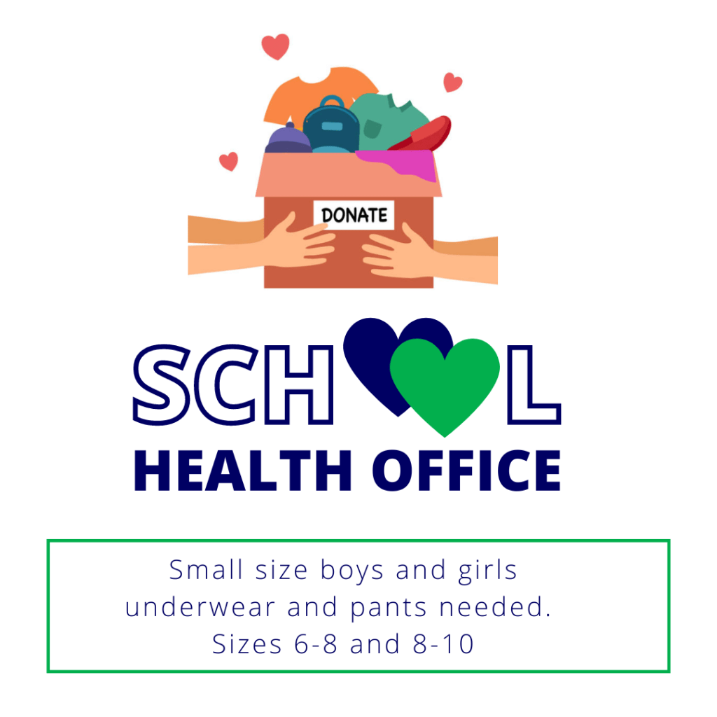 The nurse’s office is in need of small size boys and girls underwear and pants in sizes 6-8 and 8-10. Thank you!