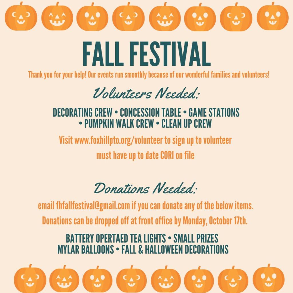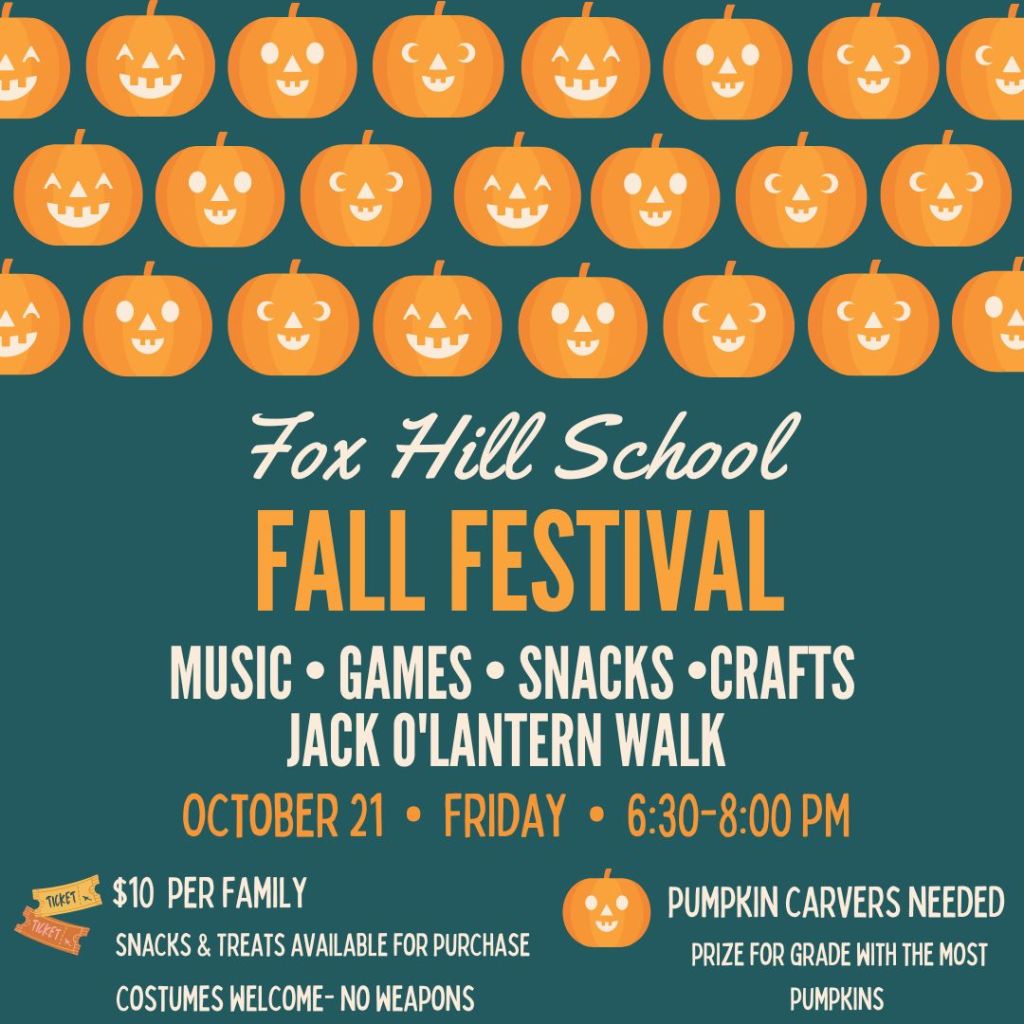 Please join us on Friday, October 21st for the Fox Hill Fall Festival! There will be music, games, snacks, crafts and a Jack O’Lantern Walk! We will create a walking path lined with Jack O’Lanterns carved by the students! 🎃Pumpkin carvers, donations and volunteers needed! Visit http://www.foxhillpto.org/fall-festival-2022 for all the details and link to the Sign Up Genius. Thank you for your support!