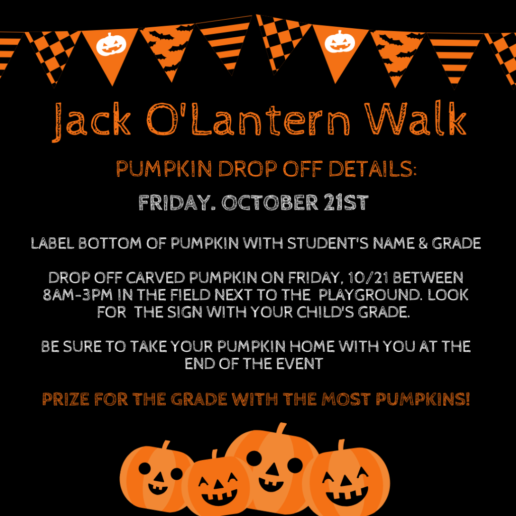 🎃We are so excited for our first Jack O’Lantern Walk at the Fall Festival on 10/21. Children are invited to carve a pumpkin and we will light all the carved pumpkins and put them in a path like display for all to see during the Fall Fest! 🎃There will be a prize for the grade with the most pumpkins!! 🏆 Check out the pumpkin drop off instructions for more info!