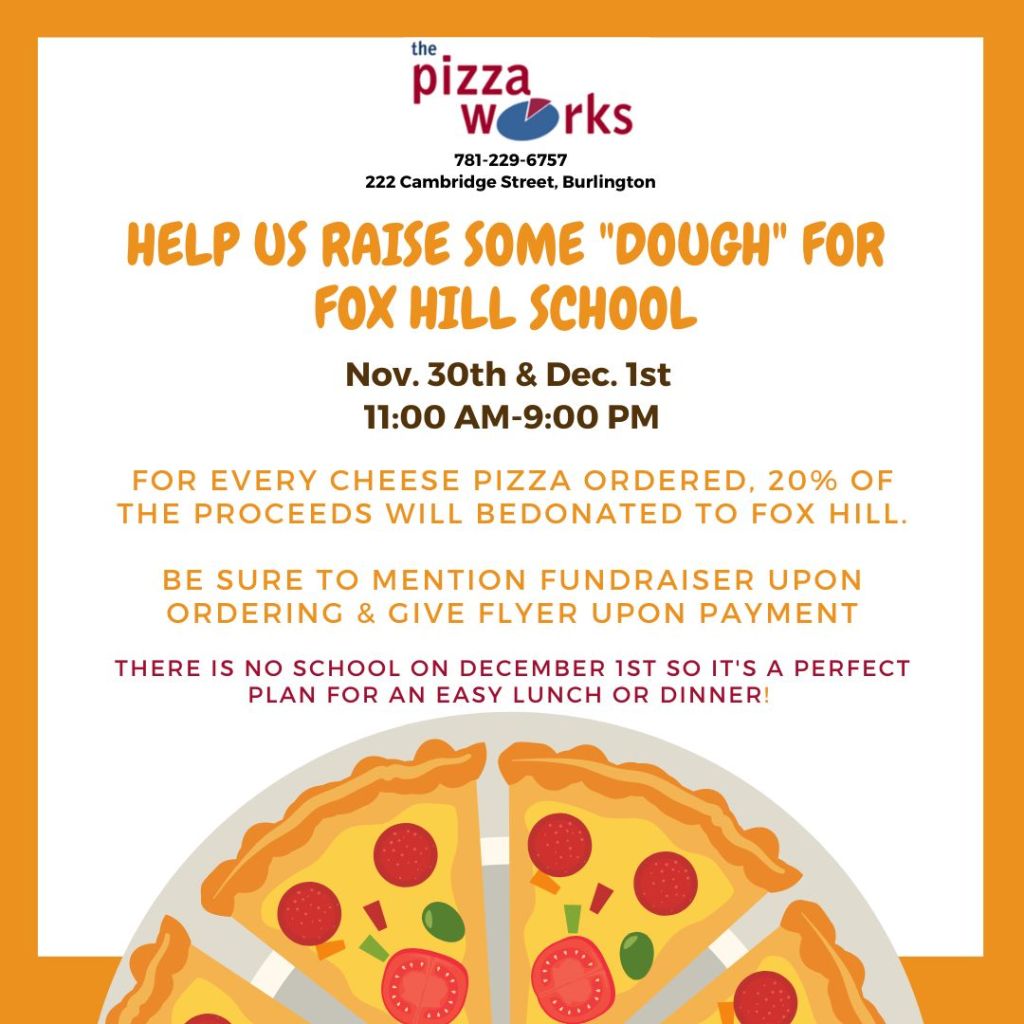 Help raise some “DOUGH” for Fox Hill School! @pizzaworksburlington will be donating 20% to our school for every cheese pizza 🍕 ordered on November 30th and December 1st! There is no school on December 1st so a perfect plan for an easy lunch or dinner!