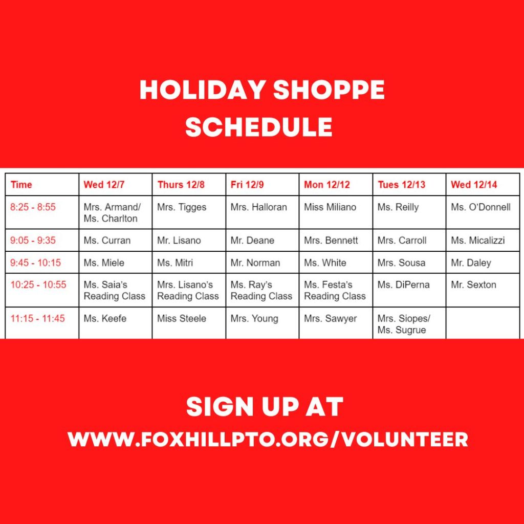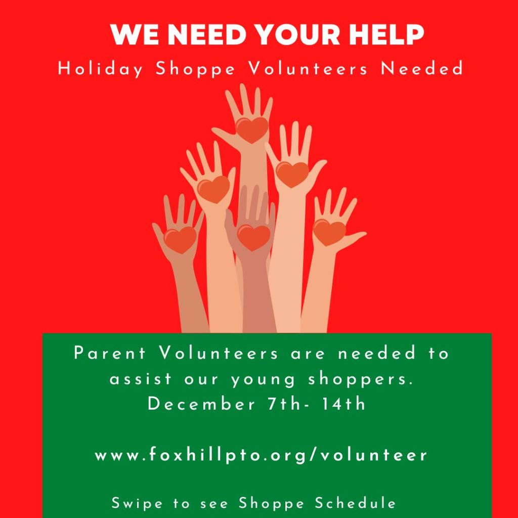 The Fox Hill Holiday Pop Up Shoppe opens tomorrow! We are still in need of parent volunteers to assist our young shoppers. Check out the Shoppe Schedule and sign up at www.foxhillpto.org/volunteer