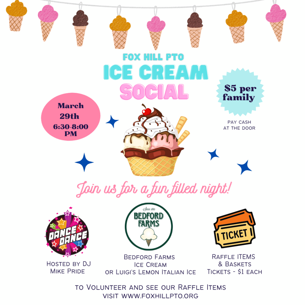 Join your Fox Hill friends for a fun filled night at the Fox Hill PTO Ice Cream Social! Wednesday, March 29th 6:30-8 PM. There will be ice cream, Italian ice, a great raffle and dancing! Looking forward to seeing you there!