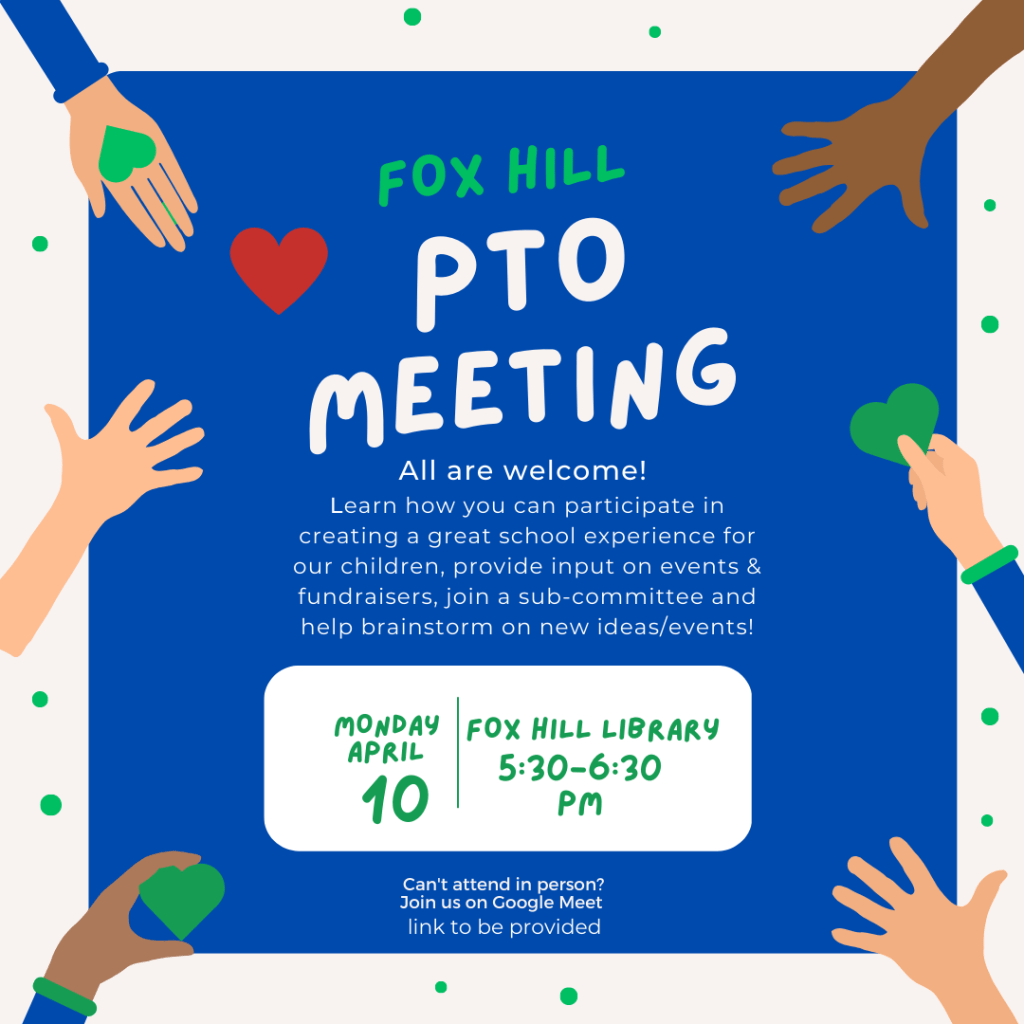 Please join us for an all member PTO Meeting on Monday, April 10th. Learn how you can participate in creating a great school experience for our children, provide input on events and fundraisers, join a sub committee, and help brainstorm on new ideas and events.