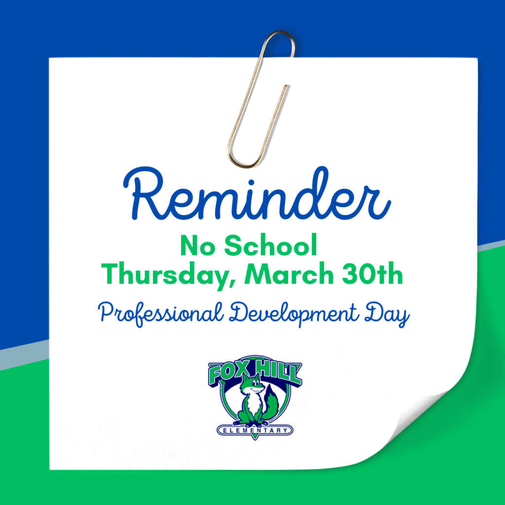 REMINDER: No School Thursday, March 30th March 29, 2023 foxhillptoburlington Share this:Share Click to print (Opens in new window) Print Click to email a link to a friend (Opens in new window) Email Like Loading...
