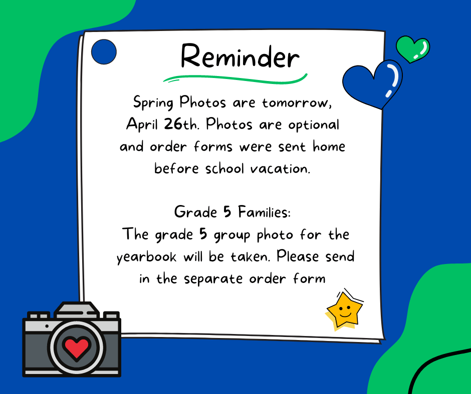 O’Connor Studios will be here to take spring photos on Wednesday, April 26th. Spring photos for all students are optional and order forms were sent home before school vacation. If you are planning to have spring photos taken, please send in the completed order form and payment with your child tomorrow.