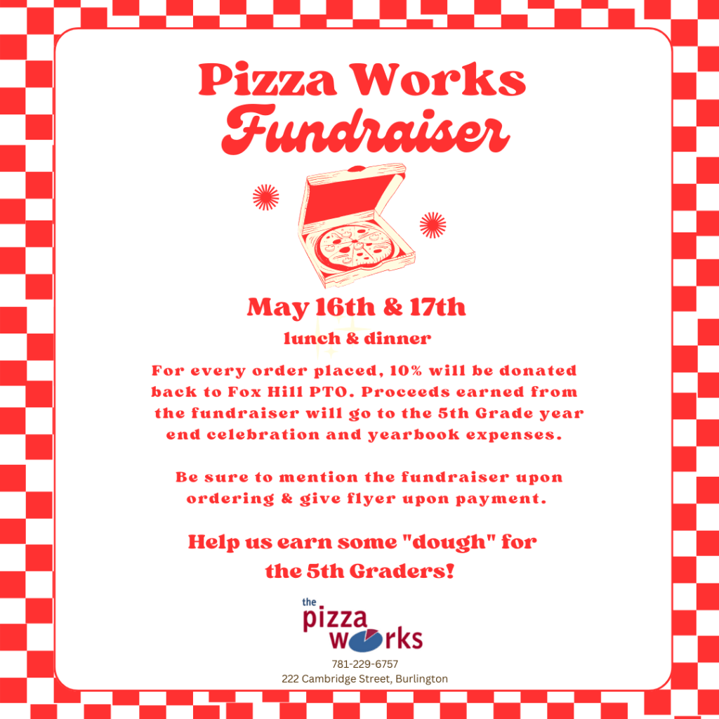 Pizza Works Fundraiser on May 16th and 17th. Be sure to mention the fundraiser when ordering and show flyer upon payment. Pizza Works will donate 10% back to the PTO. Proceeds earned from the fundraiser will go to the 5th Grade year end celebration and yearbook expenses.