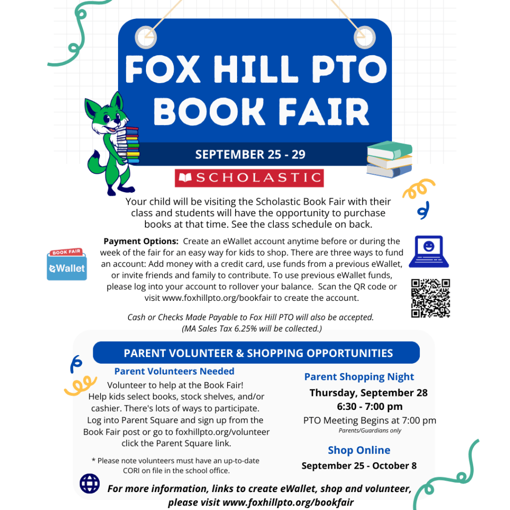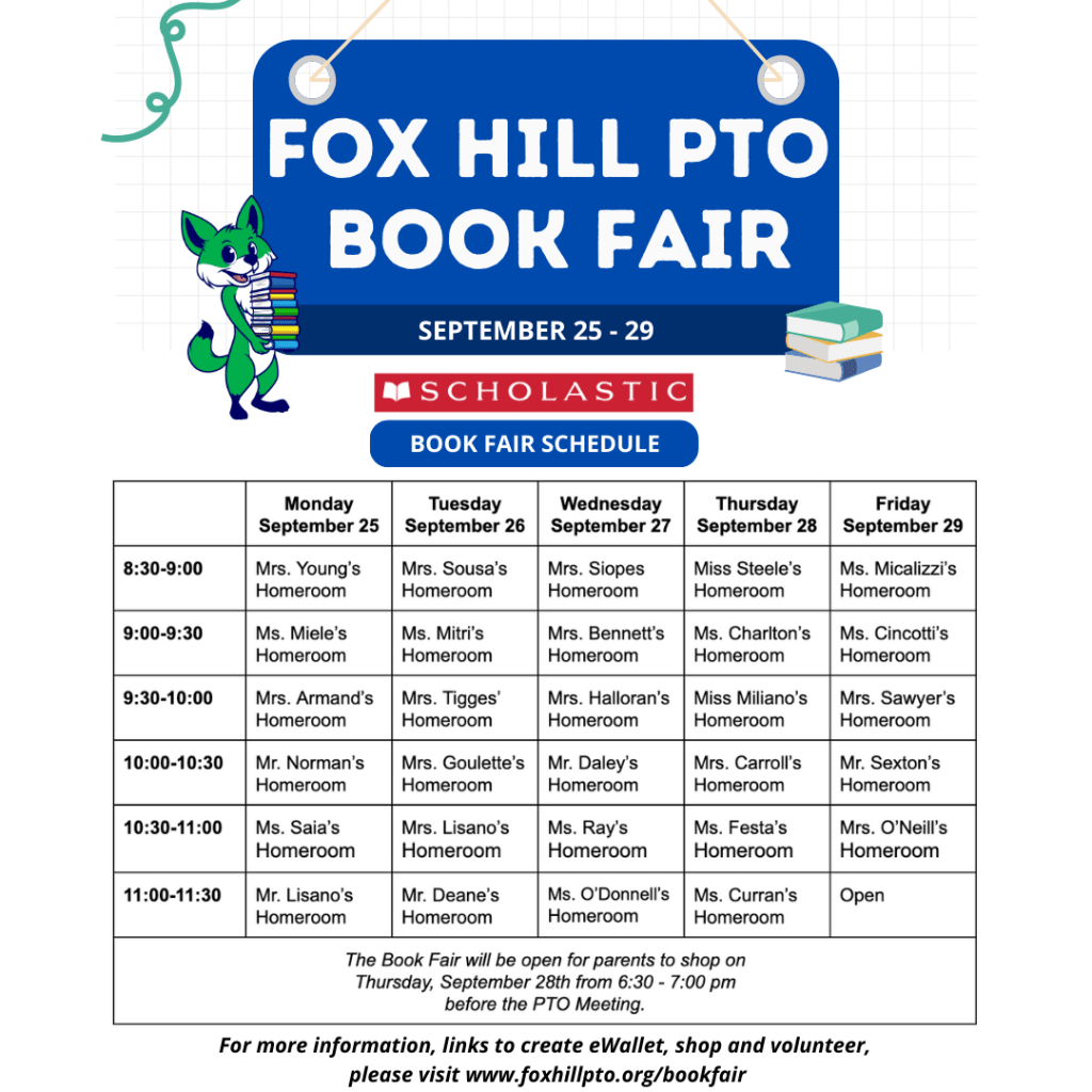 📚 Fox Hill PTO Book Fair will run from September 25th-29th! 📚Children will have an opportunity to shop at school. There will be a parent shopping night on September 28th 🛍️ See class schedule below.