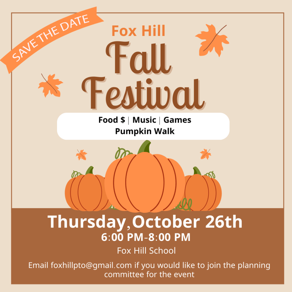 Save the date for the Fox Hill Fall Fest on Thursday, October 26th from 6-8PM!!! ๐ Stay tuned for more details!