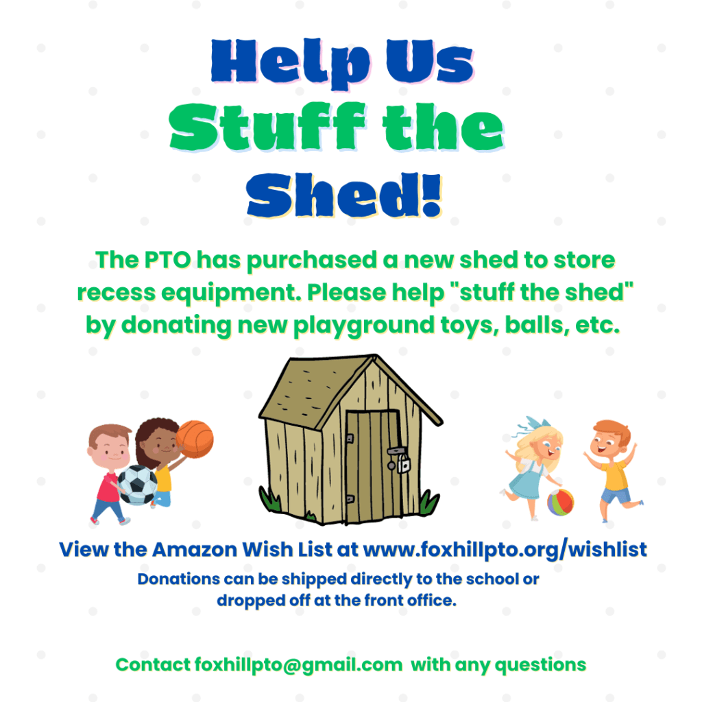 The PTO has purchased a new shed to store recess equipment. Help us Stuff the Shed!! You can view the Amazon Wish List at http://www.foxhillpto.org/wishlist