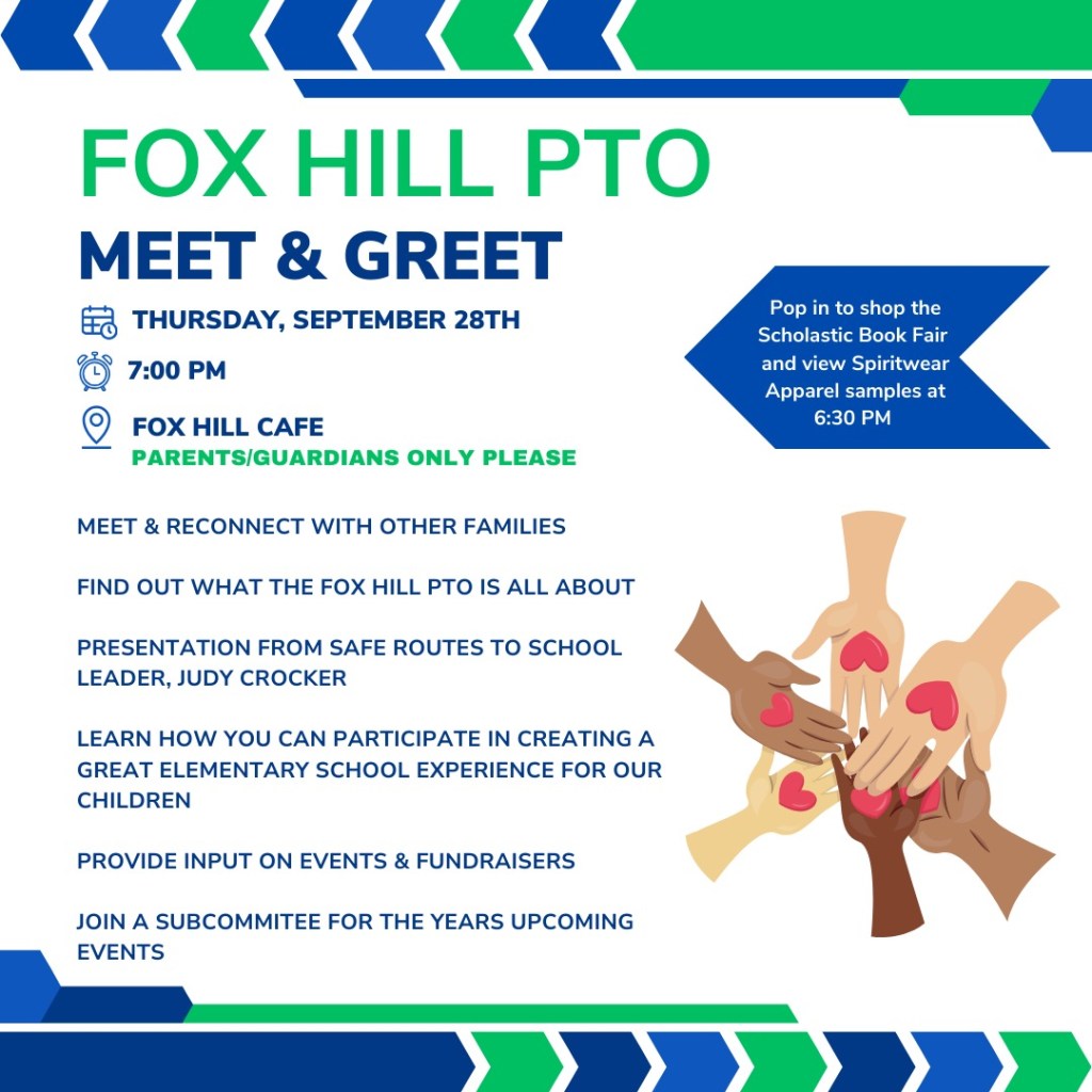 Join us on Thursday night for a PTO Meet and Greet! Doors open at 6:30- come and shop the Book Fair and check out Spiritwear samples. Meeting will start at 7:00 PM- learn about the PTO, provide input, join a committee and hear from Safe Routes to School Rep! Hope to see you there!