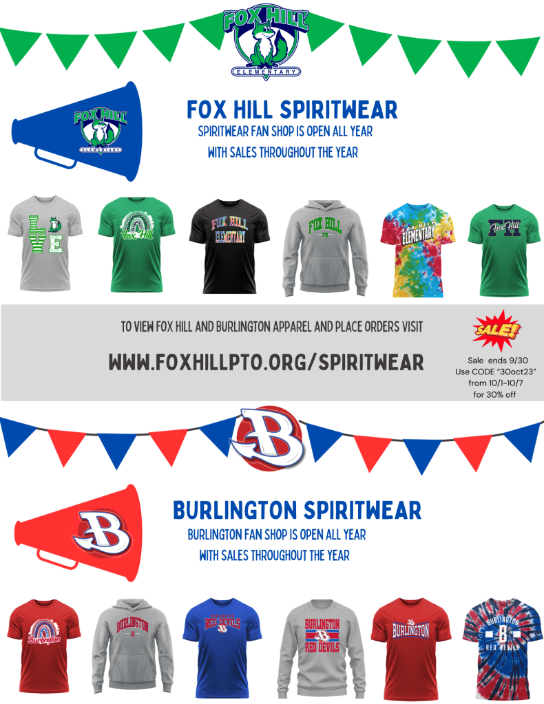 Fox Hill and Burlington Spiritwear Fan Shops are open all year with sales held throughout the year. Current sale ends on September 30.