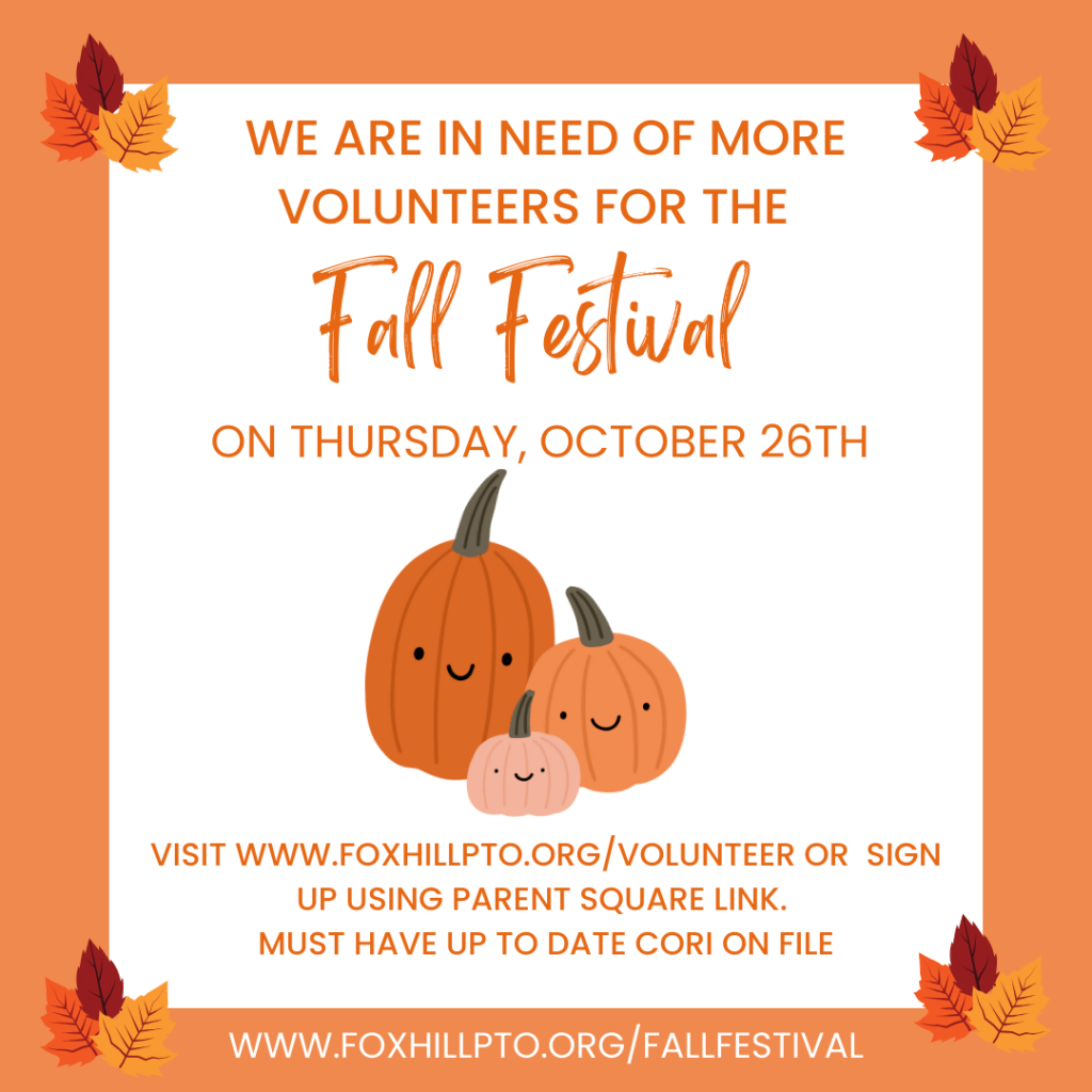 We are in need of more volunteers for the Fall Festival on Thursday, October 26th! Your help is very much appreciated. Our events run smoothly because of our wonderful families and volunteers! Please consider signing up for a shift at http://www.foxhillpto.org/volunteer or via Parent Square.