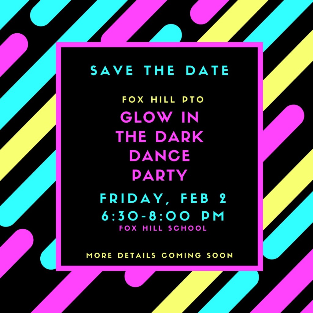 Save the Date!! More details coming soon! It’s sure to be a fun night at the Fox Hill PTO’s Glow in the Dark Dance Party!