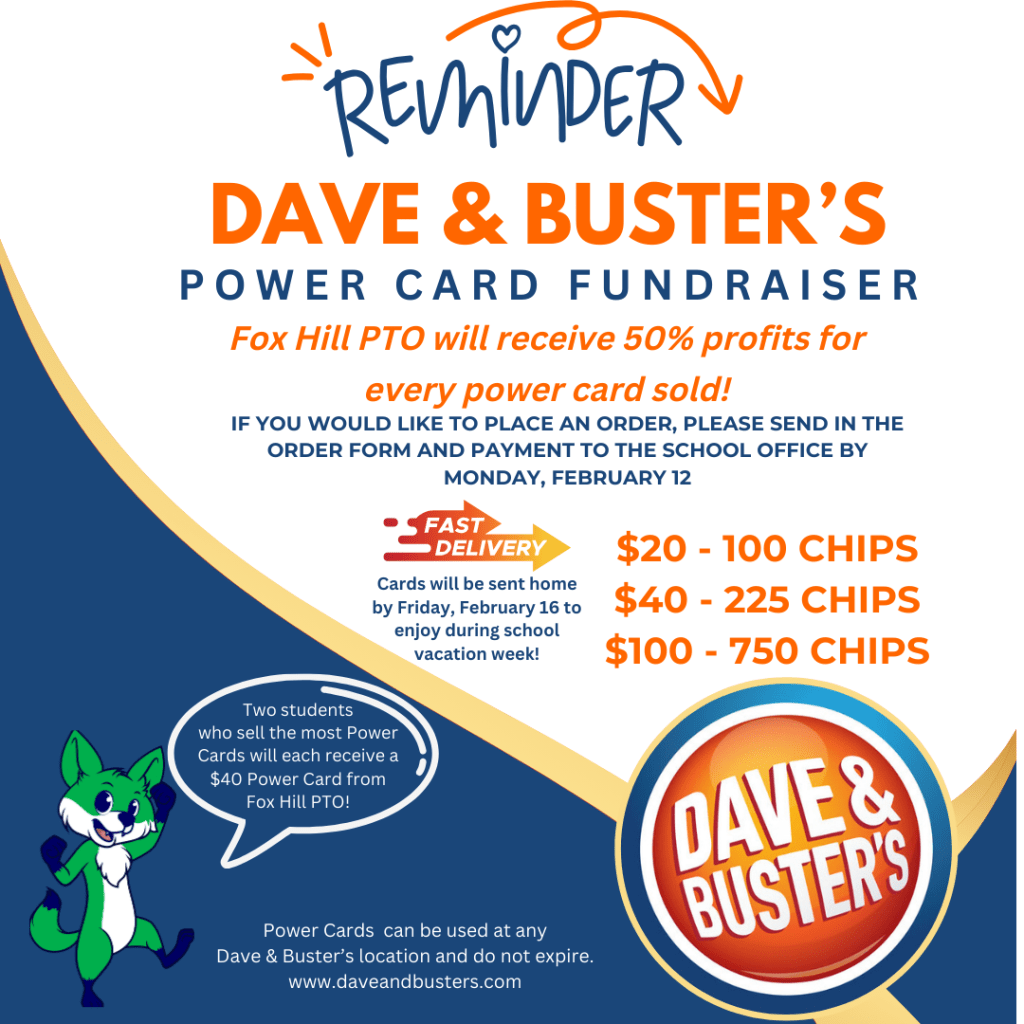 Reminder: Dave and Busters Power Card Fundraiser February 6, 2024 foxhillptoburlington REMINDER! The last day to submit orders for the Dave and Busters Fundraiser is Monday, Feb 12th! Share this:Share Click to print (Opens in new window) Print Click to email a link to a friend (Opens in new window) Email Like Loading...