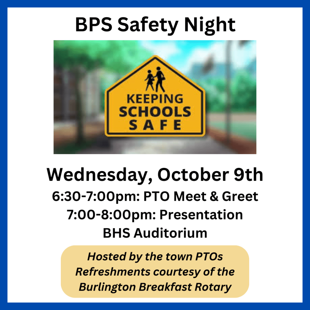 Join us for an important evening focused on the safety and well-being of our school community. The Burlington Public Schools Safety Night will showcase our longstanding partnership with the Burlington Police Department and highlight the collaborative efforts we make to ensure a secure environment for all students and staff. During this informative session, representatives from the Burlington Police Department will provide an overview of our Standard Response Protocol, explaining the procedures we have in place to handle various safety situations effectively.