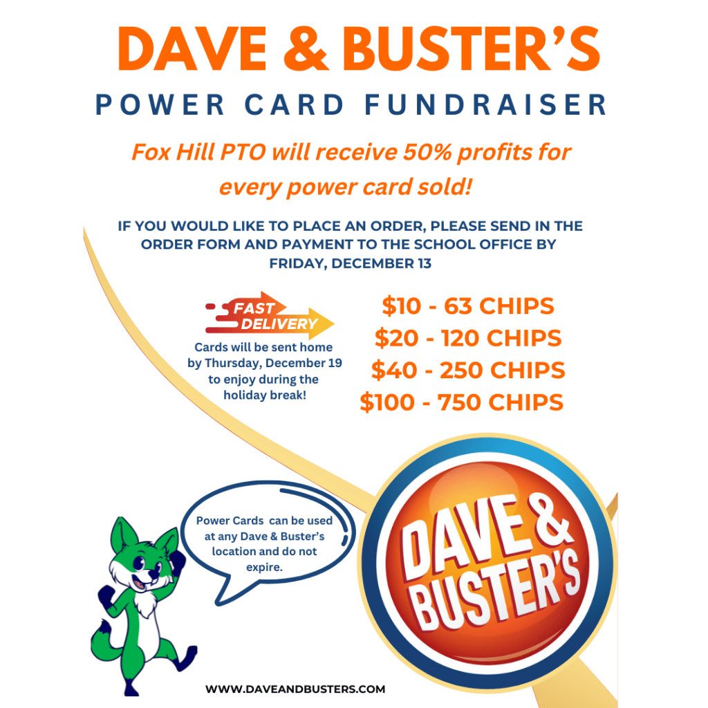 Fox Hill PTO will receive 50% profits for every power card sold! If you would like to place an order, please send in the order form and payment to the school office by Friday, December 13. The order forms will be sent home in backpacks on Monday, November 18.