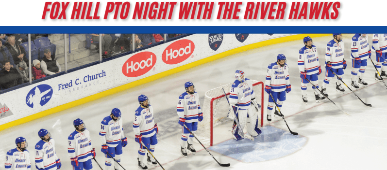 Join Fox Hill families and friends for an exciting night of Hockey East action as the UMass Lowell River Hawks take on the Boston University Terriers! A portion of every ticket purchased through this offer will go directly back to the Fox Hill PTO to support school programs. It’s a great chance to enjoy a fun night together at the rink while giving back to the school community.